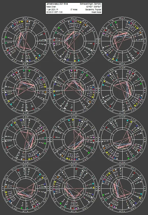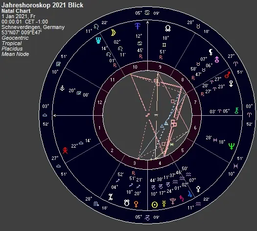 Der Aszendent entspricht dabei dem Sternzeichen. Man sieht, wie sich die Planeten dadurch von Widder bis Fische durch die verschiedenen Häuser, also Lebensbereiche wandern. Obwohl die Grunddaten also für alle gleich sind, erlebt jedes Sternzeichen die Zeitqualität anders und in anderen Lebensbereichen.